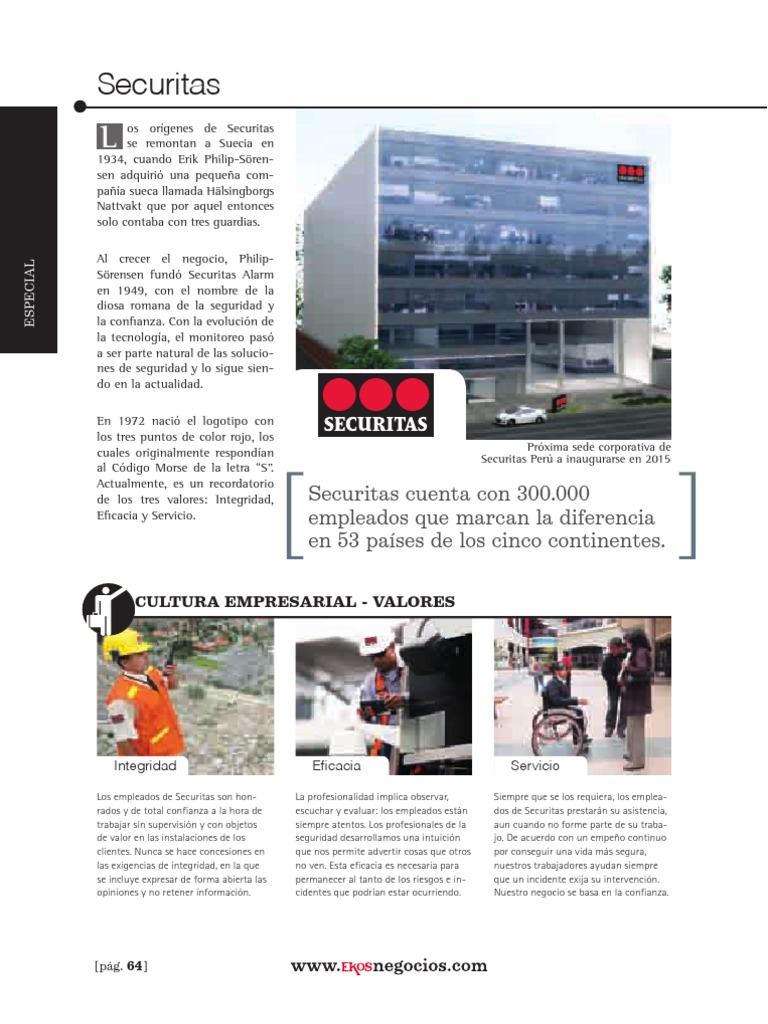 1934, cuando Erik Philip-Srensen adquiri una pequea compaa sueca llamada Hlsingborgs Nattvakt que por aquel entonces solo contaba con tres guardias. Al crecer el negocio, PhilipSrensen fund Securitas Alarm en 1949, con el nombre de la diosa romana de la seguridad y la confianza. Con la evolucin de la tecnologa, el monitoreo pas a ser parte natural de las soluciones de seguridad y lo sigue siendo en la actualidad. En 1972 naci el logotipo con los tres puntos de color rojo, los cuales originalmente respondan al Cdigo Morse de la letra S. Actualmente, es un recordatorio de los tres valores: Integridad, Eficacia y Servicio.
