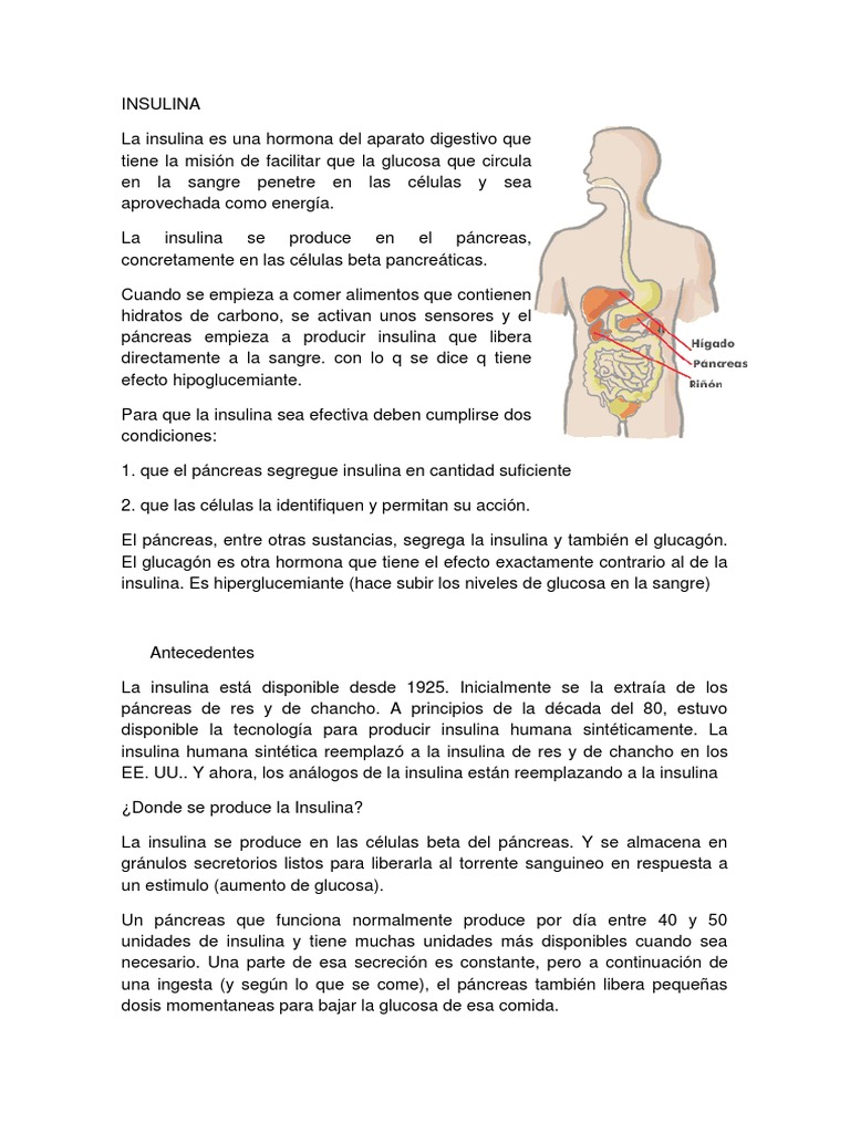 Antecedentes La insulina est disponible desde 1925. Inicialmente se la extraa de los pncreas de res y de chancho. A principios de la dcada del 80, estuvo disponible la tecnologa para producir insulina humana sintticamente. La insulina humana sinttica reemplaz a la insulina de res y de chancho en los EE. UU.. Y ahora, los anlogos de la insulina estn reemplazando a la insulina Donde se produce la Insulina? La insulina se produce en las clulas beta del pncreas. Y se almacena en grnulos secretorios listos para liberarla al torrente sanguineo en respuesta a un estimulo (aumento de glucosa). Un pncreas que funciona normalmente produce por da entre 40 y 50 unidades de insulina y tiene muchas unidades ms disponibles cuando sea necesario. Una parte de esa secrecin es constante, pero a continuacin de una ingesta (y segn lo que se come), el pncreas tambin libera pequeas dosis momentaneas para bajar la glucosa de esa comida.