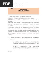 jurdico. Se define como acto Jurdico: A la manifestacin de la voluntad humana susceptible de producir efectos jurdicos. Para que produzca efecto, adems de la capacidad para realizarlo, se precisa que se verifique de acuerdo con los requisitos legales previamente establecidos para cada caso. Ejemplo, un contrato de compra venta de un automvil. Acto Mercantil. Un acto mercantil o acto de comercio es la expresin de la voluntad humana susceptible de producir efectos jurdicos dentro del mbito de la realidad reservada a la regulacin de la legislacin comercial. Los actos de comercio, o mejor dicho, los actos que nuestra legislacin califica de comerciales, constituyen la parte ms importante, aunque no la nica, de la materia comercial. Se comprueba esto si repasamos el Articulo 75 del Cdigo de comercio, y se ve mediante el anlisis de diversos actos, que en dicha norma se comprenden tanto los actos objetivos como los subjetivos; los aislados como los retirados: los actos de recaen sobre un objeto mercantil como aquellos que suponen la existencia de esa organizacin de los factores de produccin, que es la empresa. Los actos de comercio principales puedes ser absolutos y relativos; son absolutos aquellos que, de acuerdo con la ley, slo pueden ser mercantiles, nunca civiles; tal es el caso, de los contratos de derecho martimo que siempre recaen sobre cosas mercantiles; del fideicomiso, que es una operacin reservada a los banco, y el deposito en almacenes generales. Por el contrario, son actos principales de carcter relativo aquellos cuya naturaleza mercantil deriva de ciertas notas o caractersticas en ausencia de las cuales dichos actos son civiles. Tales son, por ejemplo, las compraventas de muebles e inmuebles que se celebran con la finalidad de especulacin comercial, el negocio constitutivo de las sociedades mercantiles, cuya naturaleza comercial deriva de la forma, etc. El cdigo de comercio en su artculo 1 establece que sus disposiciones son aplicables solo para actos comerciales. De aqu pudiera desprenderse que en forma absoluta el contenido de nuestro derecho mercantil lo constituyen los actos de comercio. Sin embargo, las disposiciones posteriores del propio cdigo de comercio desmienten esa afirmacin literal tan categrica. Ahora bien, aunque no es exacta, como ya dijimos, la afirmacin legal de que el ordenamiento mercantil sea exclusivamente regulador de los actos de comercio, si puede sostenerse que la nocin de acto de comercio es fundamental en el derecho mercantil. La materia mercantil, de acuerdo con el sistema de nuestro cdigo de comercio, esta delimitada en razn de los actos de comercio, sin que estos constituyan su nico contenido. esto no quiere decir que el acto de comercio absorba por completo el derecho mercantil. Significa sencillamente que el acotamiento del derecho mercantil se realiza por medio de los actos de comercio, por que son ellos los que reclaman un tratamiento distinto al que los actos sometidos al derecho civil. Con la reserva sealada puede afirmarse que el derecho mercantil en Mxico es fundamentalmente, el derecho de los actos de comercio.
