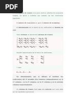As pues, como hay un determinante de orden tres que no es nulo, el rango (B) = 3. Un rango mayor que 3 no se puede hallar, ya que no se puede formar un determinante de orden 4. Recurdese que para poder calcular el determinante de una matriz o de una submatriz, stas tienen que ser cuadradas Regla de Cramer Los pasos a seguir para calcular los sistemas de ecuaciones segn la regla de Cramer son los siguientes: 1. Hallar la matriz ampliada (A b) asociada al sistema de ecuaciones, esto es: que la primera columna est formada por las entradas de los coeficientes de la primera incgnita de las ecuaciones; que la segunda columna la formen las de la segunda incgnita, y as hasta llegar a la ltima columna, que estar constituida por las entradas de los trminos independientes de las ecuaciones. 2. Calcular el determinante de A. 3. Aplicar la regla de Cramer, que consiste en: a) ir sustituyendo la primera columna del det (A) por los trminos independientes; b) dividir el resultado de este determinante entre el det (A) para hallar el valor de la primera incgnita.