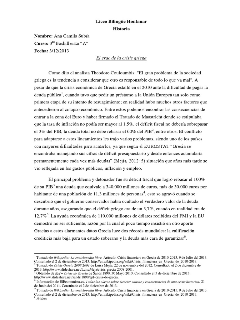 Tomado de Wikipedia: La enciclopedia libre. Artculo: Crisis financiera en Grecia de 2010-2013. 9 de Julio del 2013. Consultado el 2 de diciembre de 2013. http://es.wikipedia.org/wiki/Crisis_financiera_en_Grecia_de_2010-2013. 2 Tomado de Crisis Grecia 2008 2001 de Luisa Meja, 22 de noviembre del 2012. Consultado el 2 de diciembre de 2013. http://www.slideshare.net/LuisaMeja/crisis-grecia-2008-2001. 3 Obtenido de Epf Crisis de Grecia de Sandri1890. 30 Mayo 2010. Consultado el 3 de diciembre de 2013. http://www.slideshare.net/sandri1890/epf-crisis-de-grecia. 4 Informacin de ElEconomista.es. Todas las claves sobre Grecia: causas y consecuencias de una crisis histrica. 21 de Junio del 2011. Consultado el 2 de diciembre de 2013. 5 Tomado de Wikipedia: La enciclopedia libre. Artculo: Crisis financiera en Grecia de 2010-2013. 9 de Julio del 2013. Consultado el 2 de diciembre de 2013. http://es.wikipedia.org/wiki/Crisis_financiera_en_Grecia_de_2010-2013. 6 Ibdem.