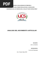 Nelson Arvelo DFreitas. Cinematica Articular. Laboratorio de Investigaciones Neuroanatmicas y Embriolgicas, Instituto Anatmico Jos Izquierdo, Facultad de Medicina, Universidad Central de Venezuela. Revista de la Sociedad Venezolana de Ciencias Morfolgicas. 2012; 18: 15-20. RESUMEN Se realiza un anlisis de la cinemtica articular, el cual hace referencia a una descripcin del movimiento en trminos de desplazamiento, velocidad y aceleracin contra el tiempo, sin ocuparse de las fuentes del movimiento, es decir las fuerzas que producen el movimiento.La cinemtica, comprende dos grandes aspectos: 1.- la artrocinematica, parte de la biomecnica que se ocupa de los movimientos intrnsecos que ocurren dentro de las articulaciones, se consideran tres tipos de movimiento; rodamiento, deslizamiento y rotacin, 2.- la osteocinematica, parte de la biomecnica, que estudia el desplazamiento de los huesos en el espacio, sin importar los msculos que se contraen para lograrlo.- Los movimientos seos desde la osteocinematica se describen en trminos de giro y balanceo(puro e impuro), los cuales se reflejan de la siguiente forma: el giro se corresponde a la rotacin y, el balanceo se corresponde a la flexion-extension, abduccin-aduccin, realizados en un plano el cual es perpendicular al eje de movimiento.- Se realiza algunas consideraciones de la biomecnica muscular y de las cadenas cinemticas.Palabras clave: Cinemtica articular, artrocinematica, osteocinematica, movimientos. SUMMARY Arthrokinematics is analyzed; it refers to a movement description in terms of displacement, speed and acceleration against timing, without taking into account the source of movement. Kinematics has two components: 1. - Arthrokinematics which is part of part of biomechanics of the intrinsic movements that are inside the joints. There are three kinds of movements: tread, glide and rotation. 2. - Osteokinematics is part of biomechanics that comprises bones displacement, without taking into account the muscles that play a role in that movement. The bony movements from the osteokinematcs point of view are described as turn and swing (pure and impure), they are turn, which corresponds to rotation, and the balancing equals flexion- extension, abduction-adduction, and performed perpendicular to the axis of movement. Some considerations are made about biomechanics and kinematics chains. Key words: Joint kinematics, arthrokinematics, osteokinematics, movements. Recibido : 06-08-2012. Aceptado: 27-08-2012.