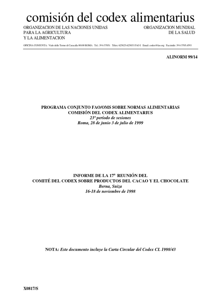 Se adjunta el informe de la 17 reunin del Comit del Codex sobre Productos del Cacao y el Chocolate (CCCPC), que ser examinado en el 23 perodo de sesiones de la Comisin del Codex Alimentarius (Roma, 28 de junio al 3 de julio de 1999). PARTE A: CUESTIONES QUE SE PRESENTAN PARA SU APROBACIN PROVISIONAL EN EL 23O PERODO DE SESIONES DE LA COMISIN DEL CODEX ALIMENTARIUS
