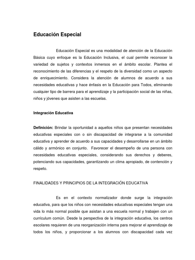 Educacin Especial es una modalidad de atencin de la Educacin Bsica cuyo enfoque es la Educacin Inclusiva, el cual permite reconocer la variedad de sujetos y contextos inmersos en el mbito escolar. Plantea el reconocimiento de las diferencias y el respeto de la diversidad como un aspecto de enriquecimiento. Considera la atencin de alumnos de acuerdo a sus necesidades educativas y hace nfasis en la Educacin para Todos, eliminando cualquier tipo de barrera para el aprendizaje y la participacin social de las nias, nios y jvenes que asisten a las escuelas.