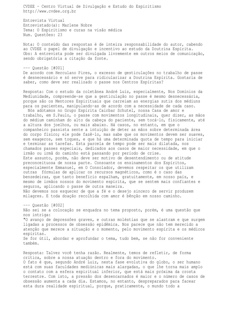 br Entrevista Virtual Entrevistado(a): Marlene Nobre Tema: O Espiritismo e curas na viso mdica Num. Questes: 23 Nota: O contedo das respostas de inteira responsabilidade do autor, cabendo ao CVDEE o papel de divulgao e incentivo ao estudo da Doutrina Esprita. Obs: A entrevista pode ser divulgada livremente em outros meios de comunicao, sendo obrigatria a citao da fonte. --- Questo [#001] De acordo com Herculano Pires, o excesso de gesticulaes no trabalho de passe desnecessrio e s serve para ridicularizar a Doutrina Esprita. Gostaria de saber, como deve ser realizado o passe nos Centros Espritas? Resposta: Com o estudo da coletnea Andr Luiz, especialmente, Nos Domnios da Mediunidade, compreende-se que a gesticulao no passe mesmo desnecessria, porque so os Mentores Espirituais que carreiam as energias sutis dos mdiuns para os pacientes, manipulando-as de acordo com a necessidade de cada caso. Ns adotamos no Grupo Esprita Cairbar Schutel, nossa Casa de amor e trabalho, em S.Paulo, o passe com movimentos longitudinais, quer dizer, as mos do mdium caminham do alto da cabea do paciente, sem toc-lo, fisicamente, at a altura dos joelhos, ou mais abaixo. H casos, no entanto, em que o companheiro passista sente a intuio de deter as mos sobre determinada rea do corpo fsico; ele pode faz-lo, mas sabe que os movimentos devem ser suaves, sem exageros, sem toques, e que h uma determinada quota de tempo para iniciar e terminar as tarefas. Esta parcela de tempo pode ser mais dilatada, nos chamados passes especiais, dedicados aos casos de maior necessidade, em que o irmo ou irm do caminho est passando por perodo de crise. Este assunto, porm, no deve ser motivo de desentendimento ou de atitude preconceituosa de nossa parte. Consoante os ensinamentos dos Espritos, especialmente Emmanuel, em O Consolador, devemos respeitar os que utilizam outras frmulas de aplicar os recursos magnticos, como o caso das benzedeiras, que tanto benefcio espalham, gratuitamente, em nosso pas, e mesmo de irmos nossos do movimento esprita, que se sentem mais confiantes e seguros, aplicando o passe de outra maneira. No devemos nos esquecer de que a f e o desejo sincero de servir produzem milagres. E toda doao recolhida com amor bno em nosso caminho. --- Questo [#002] No sei se a colocao se enquadra no tema proposto, porm, uma questo que nos intriga: "O avano de depresses graves, e outras molstias que se alastram e que surgem ligadas a processos de obsesso epidmica. Nos parece que no tem merecido a ateno que merece a situao e o momento, pelo movimento esprita e os mdicos espritas. Se for til, abordar e aprofundar o tema, tudo bem, se no for conveniente tambm. Resposta: Talvez voc tenha razo. Realmente, temos de refletir, de forma crtica, sobre a nossa atuao dentro e fora do movimento. O fato que, segundo Andr Luiz, nesta fase evolutiva do globo, o ser humano est com suas faculdades medinicas mais alargadas, o que lhe torna mais amplo o contato com a esfera espiritual inferior, que est mais prxima da crosta terrestre. Com isto, a presso dos desencarnados maior e o nmero de casos de obsesso aumenta a cada dia. Estamos, no entanto, despreparados para facear esta dura realidade espiritual, porque, praticamente, o mundo todo a