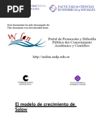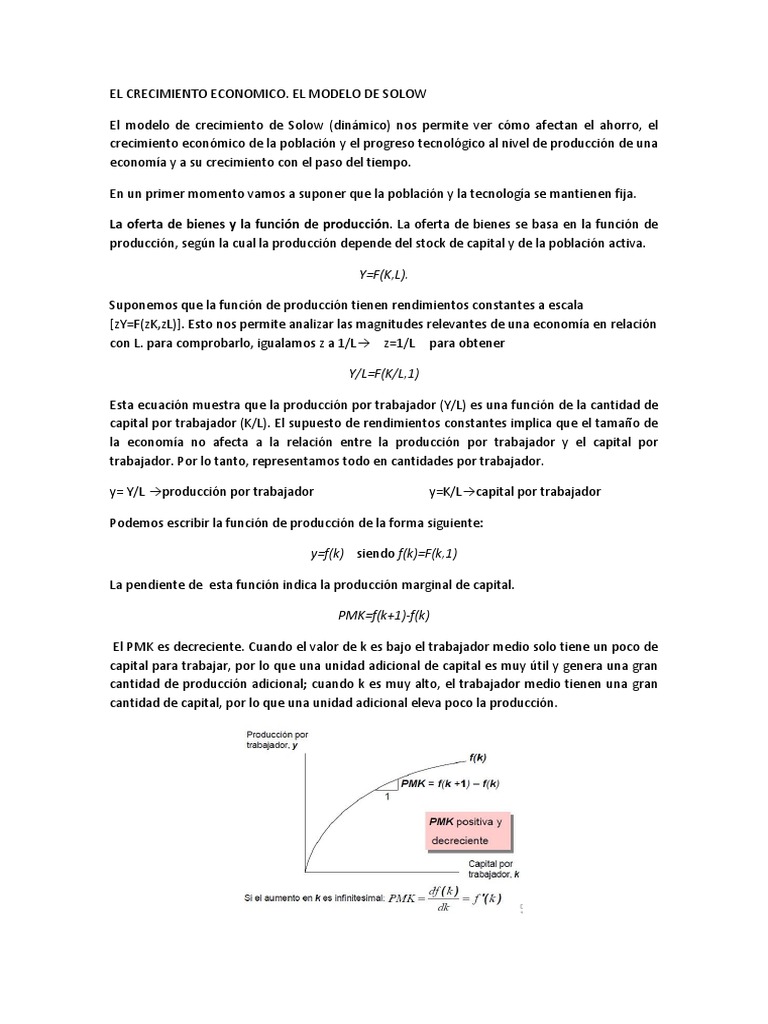 EL MODELO DE SOLOW El modelo de crecimiento de Solow (dinmico) nos permite ver cmo afectan el ahorro, el crecimiento econmico de la poblacin y el progreso tecnolgico al nivel de produccin de una economa y a su crecimiento con el paso del tiempo. En un primer momento vamos a suponer que la poblacin y la tecnologa se mantienen fija. La oferta de bienes y la funcin de produccin. La oferta de bienes se basa en la funcin de produccin, segn la cual la produccin depende del stock de capital y de la poblacin activa. Y=F(K,L). Suponemos que la funcin de produccin tienen rendimientos constantes a escala [zY=F(zK,zL)]. Esto nos permite analizar las magnitudes relevantes de una economa en relacin con L. para comprobarlo, igualamos z a 1/L z=1/L para obtener Y/L=F(K/L,1) Esta ecuacin muestra que la produccin por trabajador (Y/L) es una funcin de la cantidad de capital por trabajador (K/L). El supuesto de rendimientos constantes implica que el tamao de la economa no afecta a la relacin entre la produccin por trabajador y el capital por trabajador. Por lo tanto, representamos todo en cantidades por trabajador. y= Y/L produccin por trabajador y=K/Lcapital por trabajador