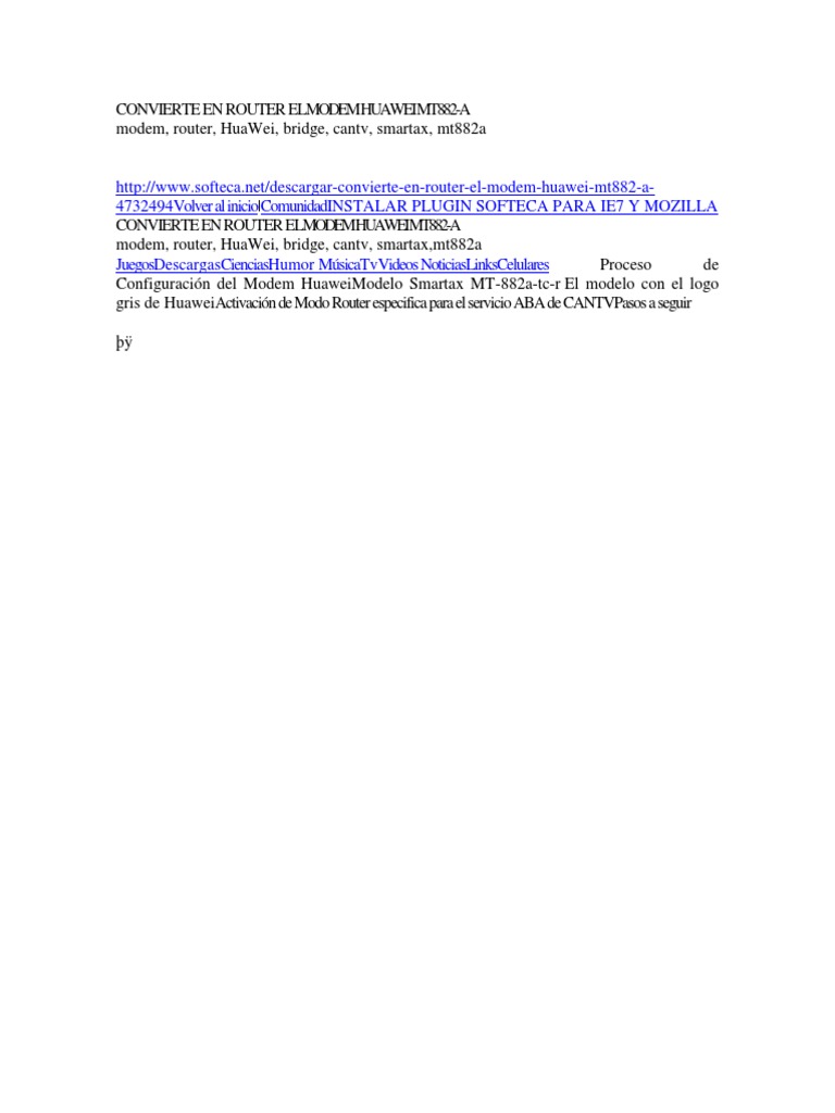[Link] al inicio|ComunidadINSTALAR PLUGIN SOFTECA PARA IE7 Y MOZILLA CONVIERTE EN ROUTER ELMODEMHUAWEIMT882-A modem, router, HuaWei, bridge, cantv, smartax,mt882a JuegosDescargasCienciasHumor MsicaTvVideos NoticiasLinksCelulares Proceso de Configuracin del Modem HuaweiModelo Smartax MT-882a-tc-r El modelo con el logo gris de HuaweiActivacin de Modo Router especifica para el servicio ABA de CANTVPasos a seguir