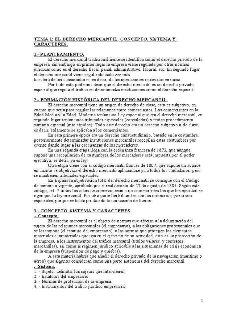 El derecho mercantil tradicionalmente se identifica como el derecho privado de la empresa, sin embargo en primer lugar la empresa viene regulada por otras normas jurdicas como es el derecho fiscal, penal, administrativo, laboral, etc. En segundo lugar el derecho mercantil viene regulando cada vez ms la esfera de los consumidores, es decir, de las operaciones realizadas en masa. Por todo esto podemos decir que el derecho mercantil es un derecho privado especial que regula el trfico en determinadas instituciones como el derecho especial. 2.- FORMACIN HISTRICA DEL DERECHO MERCANTIL. El derecho mercantil tiene un origen de derecho de clase, esto es subjetivo, en cuento que sera para regular las relaciones entre comerciantes. Los comerciantes en la Edad Media la Edad Moderna tenan una Le especial que era el derecho mercantil, en segundo lugar tenan unos tribunales especiales !consulados" tenan procedimiento sumario especial !ms rpidos". #odo este derecho era un derecho subjetivo o de clase, es decir, solamente se aplicaba a los comerciantes. En esta primera $poca era un derecho consuetudinario, basado en la costumbre, posteriormente determinadas instituciones mercantiles recopilan estas costumbres por escrito dando lugar a las ordenanzas de los mercaderes. En una segunda etapa llega con la ordenanza francesa de %&'(, que aunque supone una recopilaci)n de costumbres de los mercaderes est impuesta por el poder ejecutivo, es decir, a es le . *tra etapa viene con el c)digo mercantil franc$s de %+,', que supone un avance en cuanto s$ objetiviza el derecho mercantil aplicndose a a todos los ciudadanos, pero se mantienen tribunales especiales. En Espa-a la objetivaci)n total del derecho mercantil se consigue con el .)digo de comercio vigente, aprobado por el real decreto de // de agosto de %++0. 1eg2n este c)digo, art. / todos los actos de comercio sean o no comerciantes los que los ejecutan se rigen por la le mercantil. Por otra parte los tribunales son los ordinarios, a no son especiales, porque se haba producido la unificaci)n de fueros. 3.- CONCEPTO, SISTEMA Y CARACTERES. .- Concepto. El derecho mercantil es el objeto de normas que afectan a la delimitaci)n del sujeto de las relaciones mercantiles !el empresario", a las obligaciones profesionales que se les impone !el estatuto del empresario", a las normas que protegen los elementos materiales e inmateriales que usa en el ejercicio de su actividad, esto es la protecci)n de la empresa, a los instrumentos del trfico mercantil !ttulos valores, contratos mercantiles", as como al r$gimen jurdico aplicable a las situaciones de crisis econ)mica de la empresa !suspensi)n de pago quiebra". 3 esta materia habra que a-adir el derecho privado de la navegaci)n !martimo o a$reo" que algunos consideran como una parte aut)noma del derecho mercantil. .- S !te"#. %. 4 1ujeto5 delimitar los sujetos que intervienen. /. 4 Estatutos del empresario. (. 4 6ormas de protecci)n de la empresa. 7. 4 8nstrumentos del trfico jurdico empresarial.