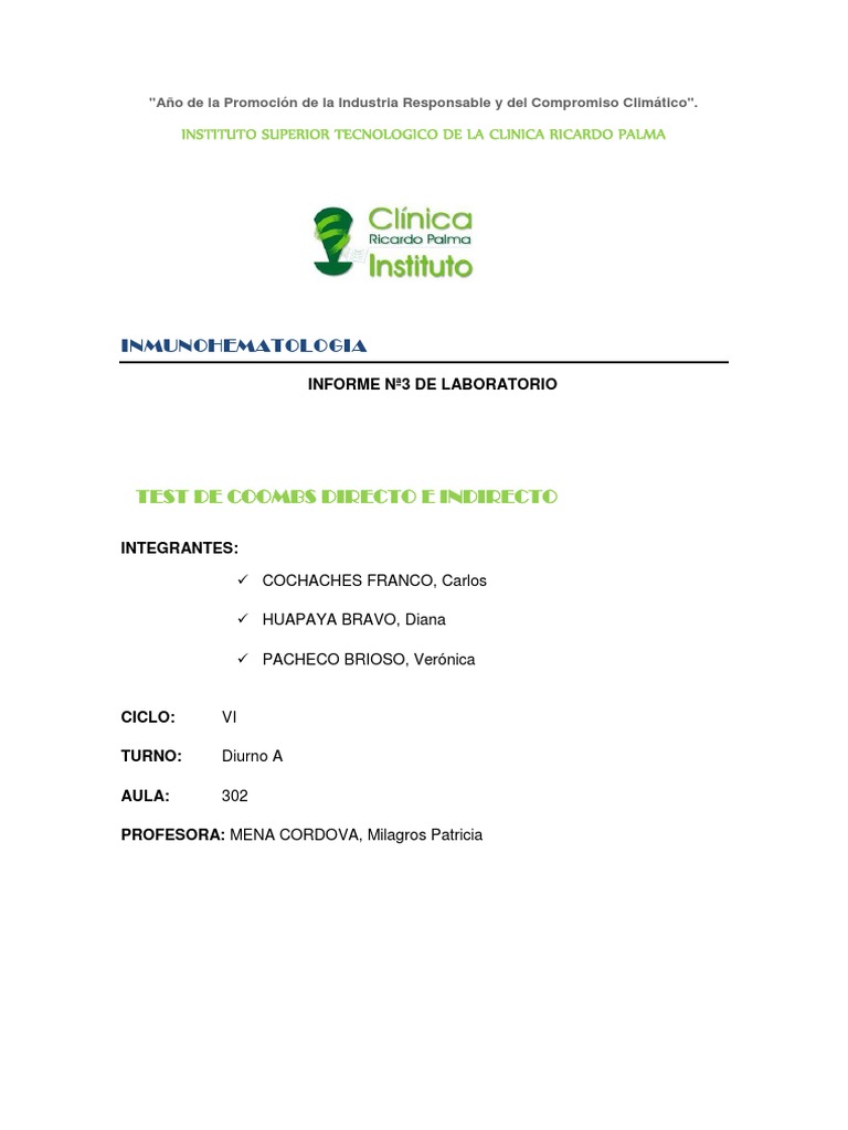 ALCANCE: El Coombs directo se realiza a pacientes en los primeros momentos de una reaccin hemoltica y en el diagnstico de anemias hemolticas autoinmunes, hemlisis inducidas por drogas, y enfermedad hemoltica del recin nacido. El Coombs indirecto se realiza a pacientes politransfundidos, embarazadas, multparas. El Coombs cruzado es una variante del Coombs indirecto y se realiza a pacientes poli transfundidos, pacientes con antecedentes de reaccin post transfusional hemoltica y a multparas para escoger sangre compatible.