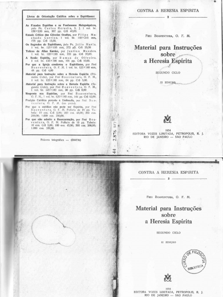 Llvros de OrentaoCatlica sobre o Espiritismo: As Fraudes Espritas e os FenrnenosMetapsquicos' pelo P e. Carlos Heredia , S . J . I v o l. b r. 150x230 mm, 367 pp. Cr$ 40,00. Estudo Crtiro das CinciasOcultas,por F i I i p e achado Carrion. 1 vo l. b r. 1 4 0 x 2 1 5 f f if f i, 175 pp. Cr$ 15,0. pelo Pe.-Jlio I\'laria. do Espiritismo, Os Segredos I r.o1.br. l25xlg5 mm, 272 pp. Cr$ 25,00 Me n d e s . Tolicesde A llan K ardec,por J u s t in o 1 vol, br. 135x190 mm, lgg pp. Cr.$ 20,00. c le O liv e ira . A l l uso E sprita,por Ramo s I vol. br. l35XigO mm, 101 pp. Cr$ 10,00. Por que a lgreja condenou o Espiritismo,por Frei mm, Boaventura, O, F. '.1 v o l. b r. 1 2 5 x 1 8 0 4B pp. Cr$ 4,00 Material parn Instruo sobre a Heresia Esprita (PrimeiroCiclo),por Frei B oa e n t u ra , O . F . 1 v 1 . , i vol. br. 125X180 mm, 64 pp. Cr$ 5,00. Material para Instruosobre a HeresiaEspirita (SegundoCclo),por F'reiB oav e n t u ra , O . F . I \ , 1 . , 1 vol. trr. 125x18mm, 96 pp. Cr$ 8,ft0 por F re i B o a v e n t ra , Re sp ostaaos E spritas, F, l\i.,.'!. r'ol.br. 125XI8C {_1. rnm,144pp. Crg 13,0fi. Fosoeat,5licaperanle a [rnbaruda, For' rei I o a*,