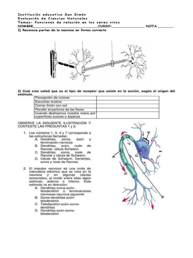 2) Cual cree usted que es el tipo de receptor que existe en la accin, segn el origen del estmulo. Percepcin de colores Escuchar msica Comer limn con sal Percibir el perfume de las flores Cuando deslizamos nuestra mano por superficies suaves o speras OBSERVE LA SIGUIENTE ILUSTRACIN Y CONTESTE LAS PREGUNTAS 1 y 2. 1. Los nmeros 1, 3, 4 y 7 corresponde a las estructuras llamadas: A. Dendritas, soma, axn y terminacin nerviosa B. Dendritas, axn, nodo de Ranvier, clula Schwann C. Dendritas, soma, nodo de Ranvier y clula de Schwann D. Clula de Schwann, Dendritas, soma y nodo de Ranvier 2. El impulso nervioso es una onda de naturaleza elctrica que se crea en la neurona y en algunas clulas sensoriales, al incidir sobre ellas algn estmulo, externo o interno. Este estmulo va en direccin: A. Dendritas-soma-axntelodendrn o terminaciones nerviosas-neurona siguiente B. Soma-dendritas-axntelodendrn C. Telodendrn-axn-somadendritas D. Dendritas-axn-somatelodendrn