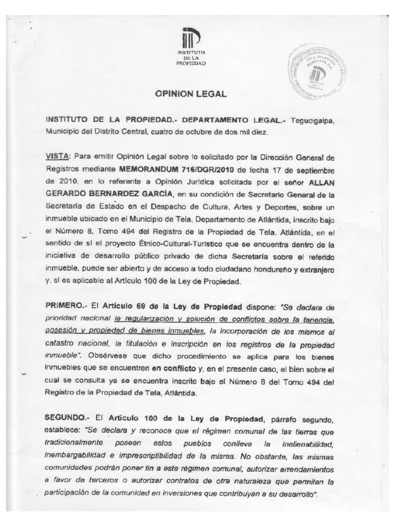 Opinion Legal Del Instituto Propiedad Sobre Desmembramiento Laguna Negra, Triunfo de La Cruz PDF