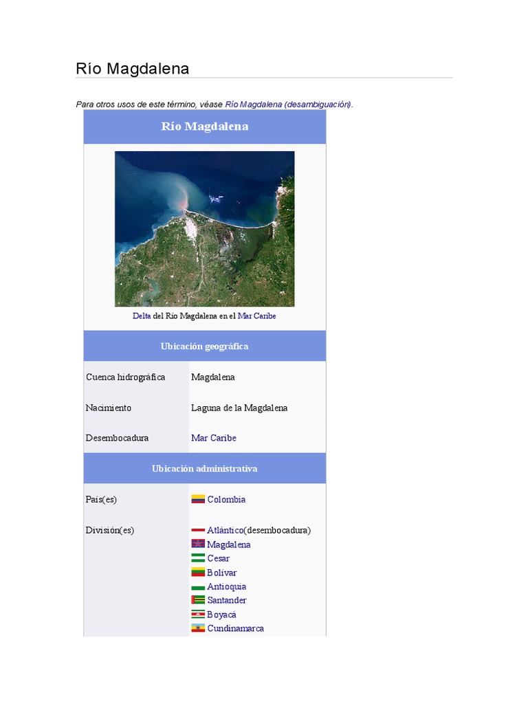 Ubicacin geogrfica Cuenca hidrogrfica Nacimiento Desembocadura Magdalena Laguna de la Magdalena Mar Caribe Ubicacin administrativa Pas(es) Divisin(es) Colombia tlntico(desembocadura) Magdalena Cesar !olvar ntio"uia #antander !o$ac Cundinamarca