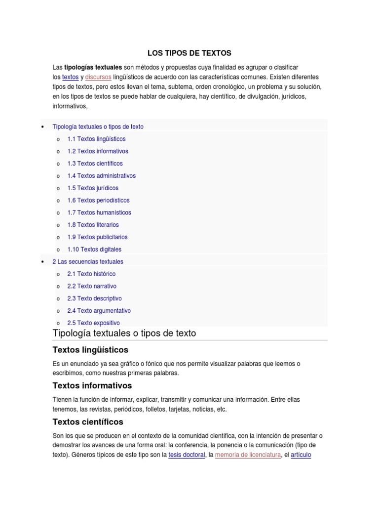 1.1 Textos lingsticos 1.2 Textos informativos 1.3 Textos cientficos 1.4 Textos administrativos 1.5 Textos jurdicos 1.6 Textos periodsticos 1.7 Textos humansticos 1.8 Textos literarios 1.9 Textos publicitarios 1.10 Textos digitales