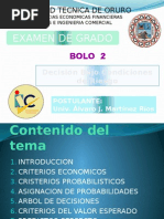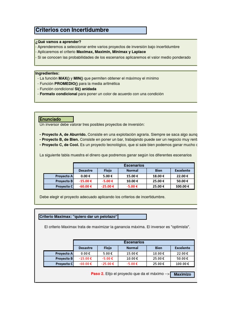 Qu vamos a aprender? - Aprenderemos a seleccionar entre varios proyectos de inversin bajo incertidumbre - Aplicaremos el criterio Maximax, Maximin, Minimax y Laplace - Si se conocen las probabilidades de los escenarios aplicaremos el valor medio ponderado