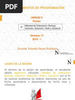 Seleccin. 1. Seleccionar el menor elemento del vector de n elementos. 2. Intercambia dicho elemento con el primero. 3. Se repiten esas operaciones con n-1 elementos restantes, se selecciona el segundo y continuamos con n-2, as sucesivamente hasta que solo quede el mayor.