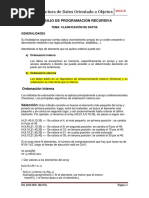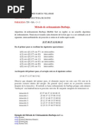 Consiste en evaluar pares de elementos contiguos del arreglo, y si el primero es mayor que el siguiente los intercambia, segn la condicin. Todo sucede dentro de dos ciclos (for) que recorren el arreglo. El ciclo ms interno realiza las comparaciones, y es ah donde el elemento mayor ocupara una posicin mayor. Formas de Mtodo Burbuja: Comparando primer elemento con el segundo, luego segundo con tercero y sucesivamente. for (i=1;i<Nelementos;i++) { for (j=0;j<=Nelementos-1 ;j++) { if (array[j] > array[j+1]) { Aux=array[j]; array[j]=array[j+1]; array[j+1]=Aux; } } }