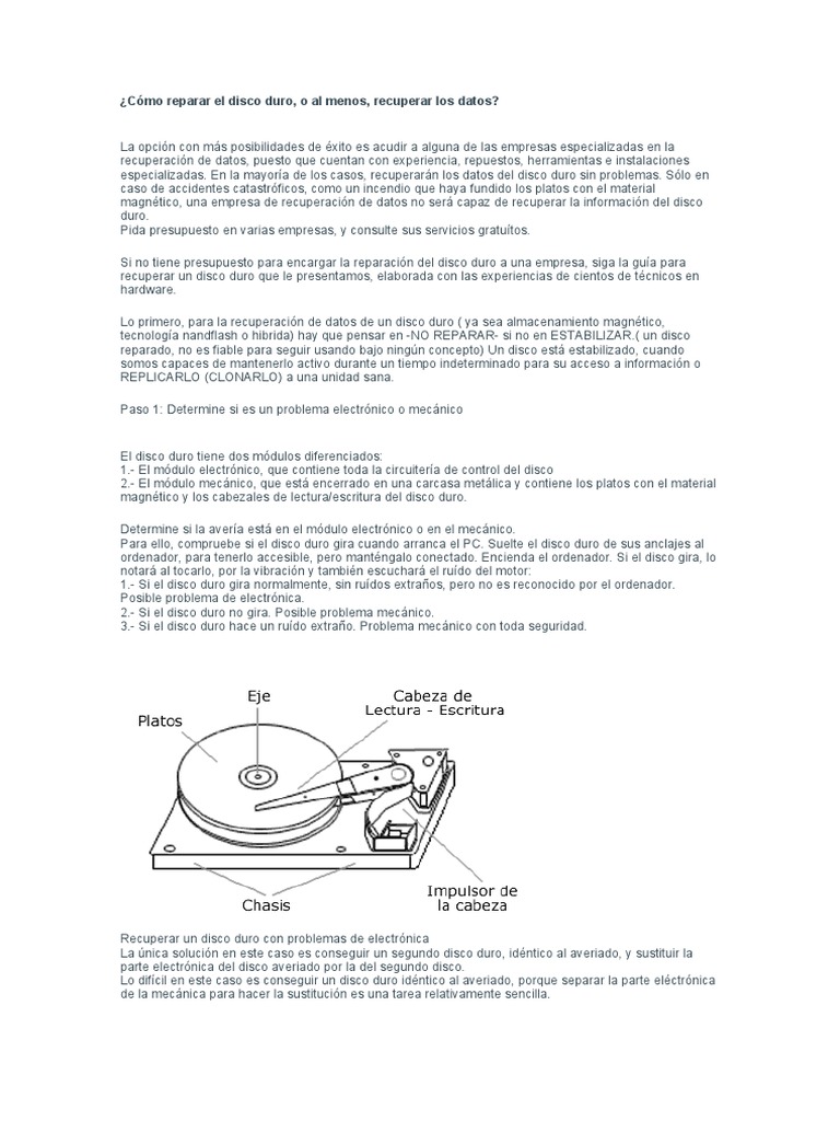El disco duro tiene dos mdulos di erenciados4 3.& El mdulo electrnico, que contiene toda la circuitera de control del disco 6.& El mdulo mecnico, que est encerrado en una carcasa metlica y contiene los platos con el material magntico y los cabezales de lectura7escritura del disco duro. 5etermine si la a"era est en el mdulo electrnico o en el mecnico. !ara ello, compruebe si el disco duro gira cuando arranca el !2. Suelte el disco duro de sus ancla/es al ordenador, para tenerlo accesible, pero mantngalo conectado. Encienda el ordenador. Si el disco gira, lo notar al tocarlo, por la "ibracin y tambin escuchar el rudo del motor4 3.& Si el disco duro gira normalmente, sin rudos extra8os, pero no es reconocido por el ordenador. !osible problema de electrnica. 6.& Si el disco duro no gira. !osible problema mecnico. 9.& Si el disco duro hace un rudo extra8o. !roblema mecnico con toda seguridad.