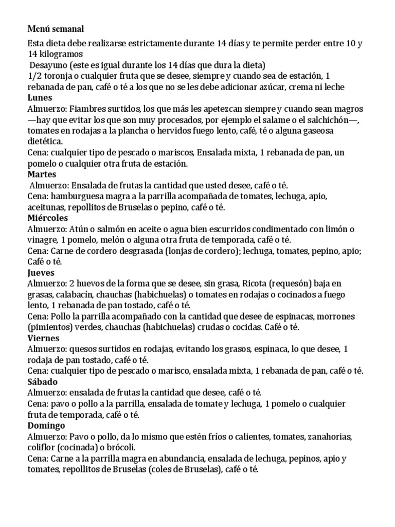 es igual durante los 14 das que dura la dieta) 1/2 toronja o cualquier fruta que se desee, siempre y cuando sea de estacin, 1 rebanada de pan, caf o t a los que no se les debe adicionar azcar, crema ni leche Lunes Almuerzo: Fiambres surtidos, los que ms les apetezcan siempre y cuando sean magros hay que evitar los que son muy procesados, por ejemplo el salame o el salchichn, tomates en rodajas a la plancha o hervidos fuego lento, caf, t o alguna gaseosa diettica. Cena: cualquier tipo de pescado o mariscos, Ensalada mixta, 1 rebanada de pan, un pomelo o cualquier otra fruta de estacin. Martes Almuerzo: Ensalada de frutas la cantidad que usted desee, caf o t. Cena: hamburguesa magra a la parrilla acompaada de tomates, lechuga, apio, aceitunas, repollitos de Bruselas o pepino, caf o t. Mircoles Almuerzo: Atn o salmn en aceite o agua bien escurridos condimentado con limn o vinagre, 1 pomelo, meln o alguna otra fruta de temporada, caf o t. Cena: Carne de cordero desgrasada (lonjas de cordero); lechuga, tomates, pepino, apio; Caf o t. Jueves Almuerzo: 2 huevos de la forma que se desee, sin grasa, Ricota (requesn) baja en grasas, calabacn, chauchas (habichuelas) o tomates en rodajas o cocinados a fuego lento, 1 rebanada de pan tostado, caf o t. Cena: Pollo la parrilla acompaado con la cantidad que desee de espinacas, morrones (pimientos) verdes, chauchas (habichuelas) crudas o cocidas. Caf o t. Viernes Almuerzo: quesos surtidos en rodajas, evitando los grasos, espinaca, lo que desee, 1 rodaja de pan tostado, caf o t. Cena: cualquier tipo de pescado o marisco, ensalada mixta, 1 rebanada de pan, caf o t. Sbado Almuerzo: ensalada de frutas la cantidad que desee, caf o t. Cena: pavo o pollo a la parrilla, ensalada de tomate y lechuga, 1 pomelo o cualquier fruta de temporada, caf o t. Domingo Almuerzo: Pavo o pollo, da lo mismo que estn fros o calientes, tomates, zanahorias, coliflor (cocinada) o brcoli. Cena: Carne a la parrilla magra en abundancia, ensalada de lechuga, pepinos, apio y tomates, repollitos de Bruselas (coles de Bruselas), caf o t.