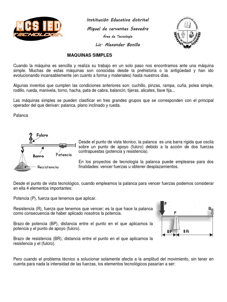 Actividad Copia el contenido de esta gua en el cuaderno Investiga los trminos desconocidos Realiza 5 ejemplos de cada tipo de Maquinas Simples sealando sus partes.