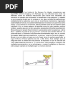 Desplazamiento de la potencia (dP), es la distancia que se desplaza el punto de aplicacin de la potencia cuando la palanca oscila. Movimiento de la resistencia (dR), distancia que se desplaza el punto de aplicacin de la resistencia al oscilar la palanca Brazo de potencia (BP), distancia entre el punto de aplicacin de la potencia y el fulcro. Brazo de resistencia (BR), distancia entre el punto de aplicain de la resistencia y el fulcro. Un poco de historia Los inventos basados en la palanca se fueron desarrollando a lo largo de los siglos y tuvieron aplicaciones en campos muy diversos: fuerza, medicin, transporte. En la prehistoria ya se empleaba de forma inconsciente para amplificar el polpe (hachas y martillos) y el transporte de materiales sobre palos que se sujetaban con las manos en un extremo y arrastraban por el suelo en el otro (narria). En el 3200 a. de C. ya se emplea en forma de lanza en los carros (palanca de 2 grado) Hacia el 2800 a. de C. se empleaba en Egipto remos fijos apoyados en chumaceras o aros para el desplazamiento por el Nilo (Palanca de 2 grado) Hacia el 2650 a. de C. ya se empleaba de forma habitual en Egipto y Mesopotamia la balanza de brazos mviles en cruz para la medicin de masas (palanca de 1er grado). Sobre el 2600 se empleaban palancas de grandes proporciones para el movimiento de grandes bloques de piedra empleados en la construccin de las primeras pirmides (palanca de 2 grado). Por el 2500 a. de C. los artesanos de Ur (Mesopotamia) ya empleaban las pinzas en trabajos delicados (palanca de 3er grado). En el 2000 a. de C. ya se empleaba para el funcionamiento de las cerraduras en forma de llave. Por el 1550 empez a emplearse en Egipto y Mesopotamia en forma de cigoal (Shadoof) para la extraccin del agua de los ros, extendindose rpidamente por todas las culturas fluviales. Eran grandes palancas de primer grado que posteriormente evolucionaran hacia las grandes gras egipcias. Hacia el 1000 a. de C. ya se fabricaban tijeras de hierro para trasquilar ovejas en forma de palancas de tercer grado. En el 250 a. de C. Arqumedes descubre el principio de la palanca, con lo que este es el momento en el que empieza el uso tecnolgico y consciente de esta mquina. Utilidad Segn la combinacin de los puntos de aplicacin de potencia y resistencia y la posicin del fulcro se pueden obtener tres tipos de palancas: