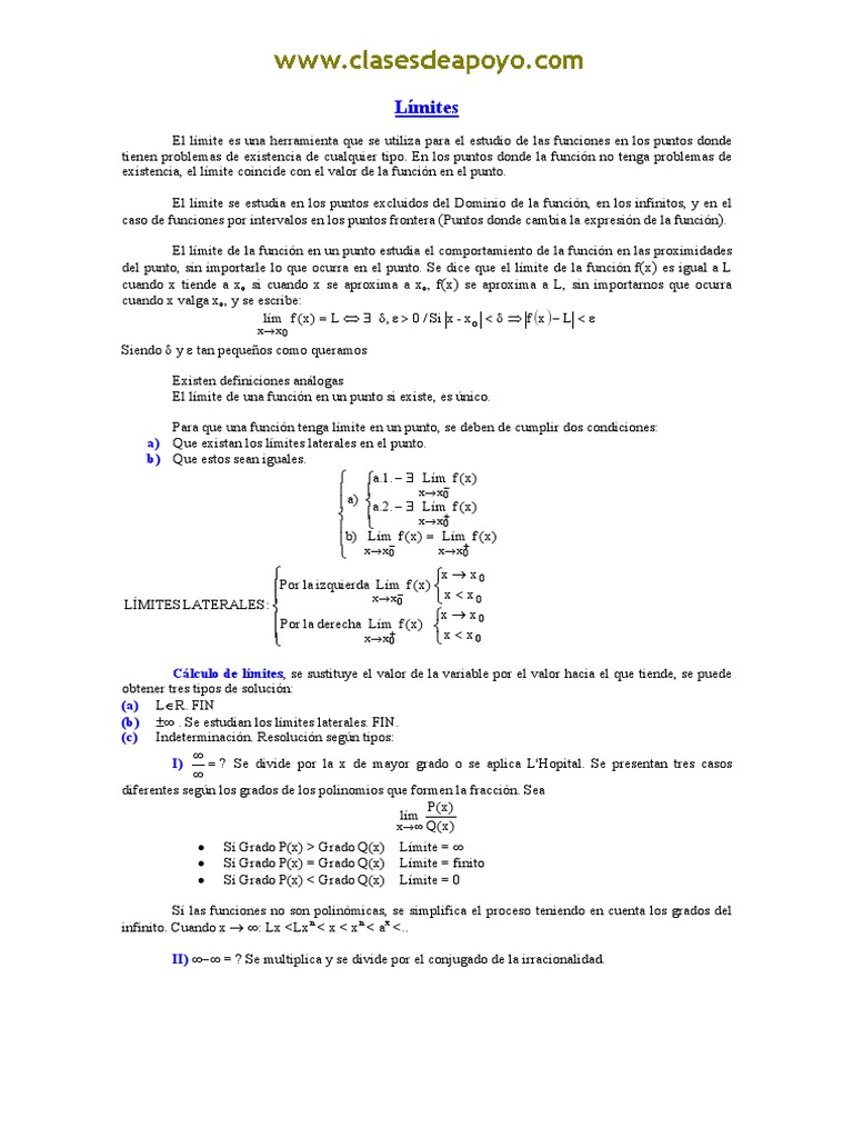 El lmite se estudia en los puntos excluidos del Dominio de la funcin, en los infinitos, y en el