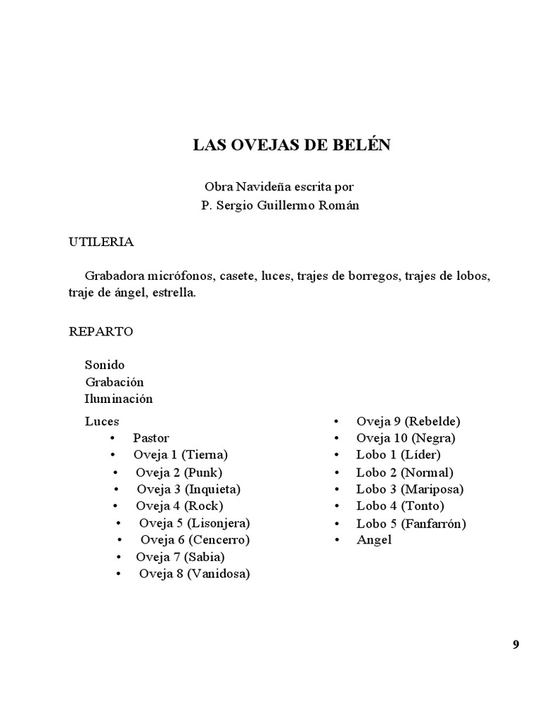 Obra Navidea escrita por P. Sergio Guillermo Romn UTILERIA Grabadora micrfonos, casete, luces, trajes de borregos, trajes de lobos, traje de ngel, estrella. REPARTO Sonido Grabacin Iluminacin Luces Pastor Oveja 1 (Tierna) Oveja 2 (Punk) Oveja 3 (Inquieta) Oveja 4 (Rock) Oveja 5 (Lisonjera) Oveja 6 (Cencerro) Oveja 7 (Sabia) Oveja 8 (Vanidosa) Oveja 9 (Rebelde) Oveja 10 (Negra) Lobo 1 (Lder) Lobo 2 (Normal) Lobo 3 (Mariposa) Lobo 4 (Tonto) Lobo 5 (Fanfarrn) Angel