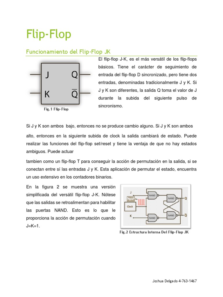 Si J y K son ambos bajo, entonces no se produce cambio alguno. Si J y K son ambos alto, entonces en la siguiente subida de clock la salida cambiar de estado. Puede realizar las funciones del flip-flop set/reset y tiene la ventaja de que no hay estados ambiguos. Puede actuar tambien como un flip-flop T para conseguir la accin de permutacin en la salida, si se conectan entre s las entradas J y K. Esta aplicacin de permutar el estado, encuentra un uso extensivo en los contadores binarios. En la figura 2 se muestra una versin simplificada del verstil flip-flop J-K. Ntese que las salidas se retroalimentan para habilitar las puertas NAND. Esto es lo que le proporciona la accin de permutacin cuando J=K=1.