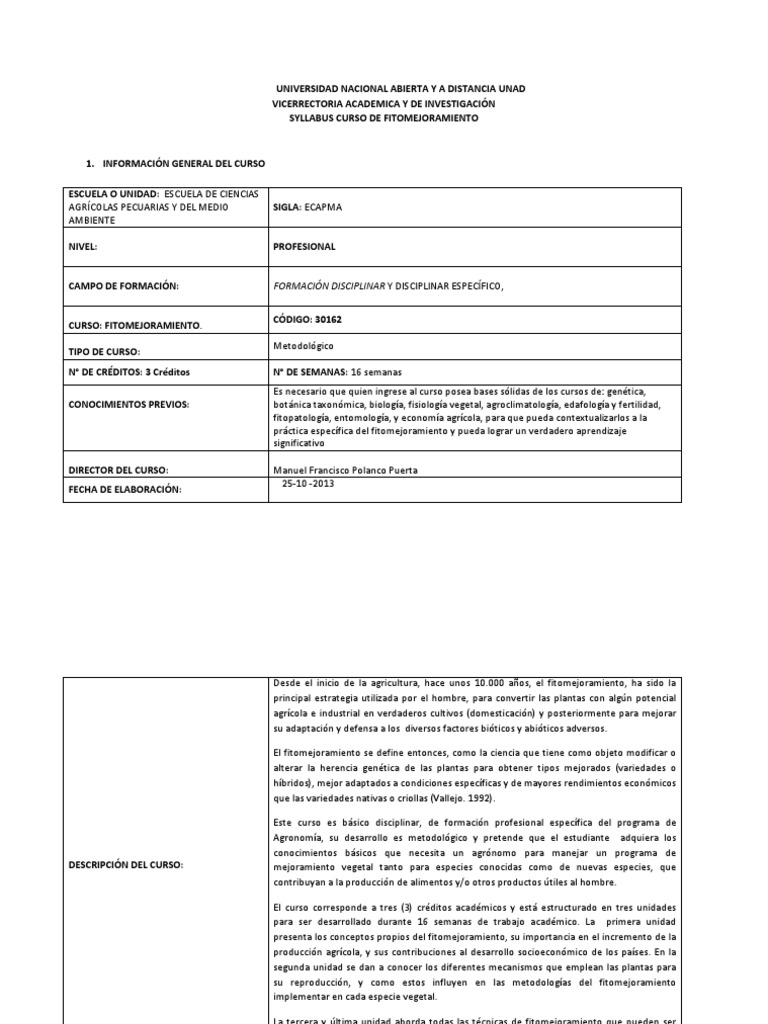 UNIVERSIDAD NACIONAL ABIERTA Y A DISTANCIA UNAD VICERRECTORIA ACADEMICA Y DE INVESTIGACIN SYLLABUS CURSO DE FITOMEJORAMIENTO