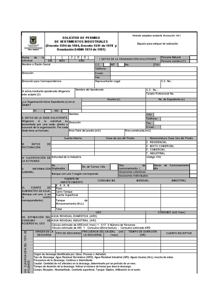 SOLICITUD DE PERMISO DE VERTIMIENTOS INDUSTRIALES (Decreto 1594 de 1984, Decreto 1541 de 1978 y Resolucin DAMA 1074 de 1997)