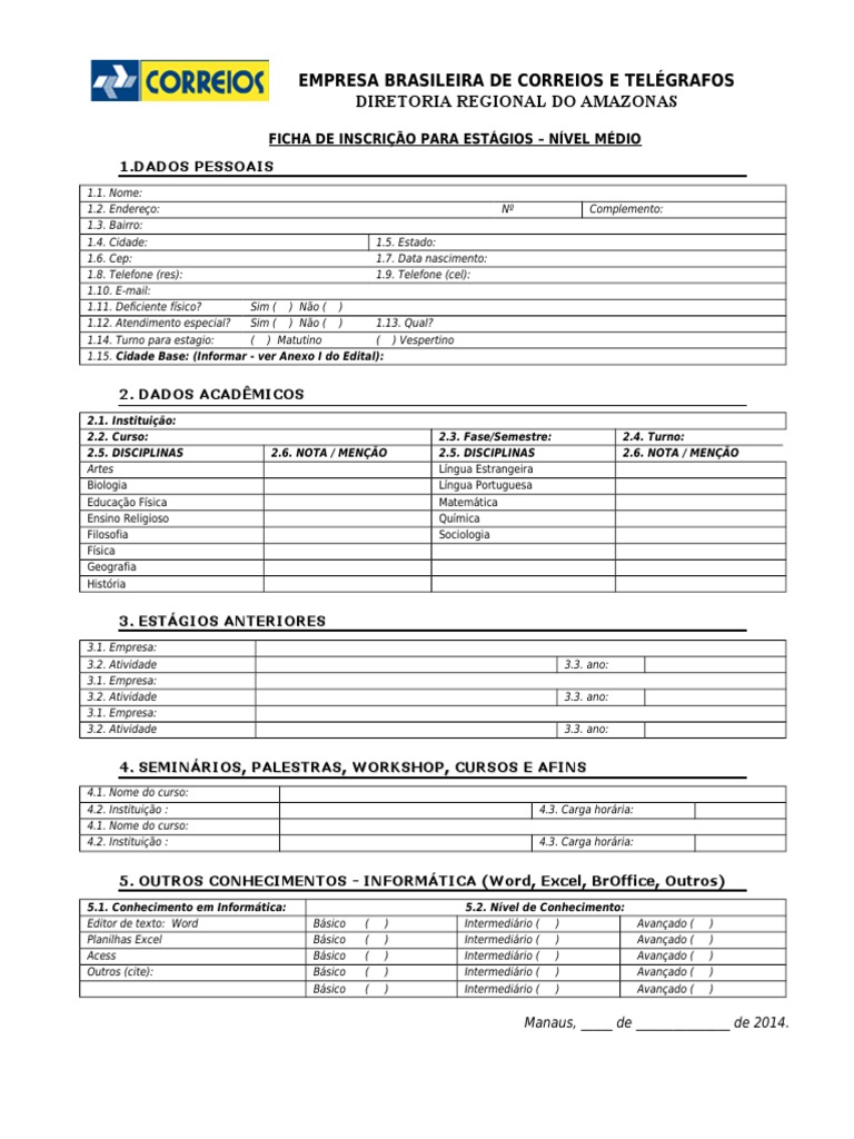 Campo ! ! NOME " !ndicar o nome com"leto do "artici"ante# Campo !#! ENDEREO $ !ndicar o endereo com"leto do "artici"ante# Campo !$! BAIRRO $ !ndicar o %airro de resid&ncia do "artici"ante# Campo !%! CIDADE $ !ndicar a cidade de resid&ncia do "artici"ante# Campo !&! ESTADO $ !ndicar o estado de resid&ncia do "artici"ante# Campo !'! CEP $ !ndicar o 'EP com"leto do "artici"ante# Campo !(! DATA DE NASCIMENTO ( !ndicar a data de nascimento do "artici"ante# Campo !)! TELEFONE *RES+ $ !ndicar o telefone residencial do "artici"ante# Campo !,! TELEFONE *CEL+ $ !ndicar o telefone celular do "artici"ante )se *ou+er,# Campo ! -! E"MAIL $ !ndicar o endereo de e$mail do "artici"ante )se *ou+er,# Campo ! ! DEFICIENTE FSICO $ !ndicar se o "artici"ante - deficiente fsico )S!M./01,# Campo ! #! ATENDIMENTO ESPECIAL $ !ndicar se o "artici"ante2 deficiente fsico2 necessita de atendimento es"ecial )S!M./01,# Campo ! $! .UAL/ $ !ndicar o ti"o de atendimento es"ecial o deficiente necessita# Campo ! %! HORRIO PARA ESTAGIO ( !ndicar o *orrio o 3ual "retende estagiar# Campo ! &! !ndicar a C01a12 Ba32 onde "retende reali4ar o estgio )5er 6ne7o !,8 Campo #! ! INSTITUIO ( !ndicar a instituio na 3ual o "artici"ante estuda atualmente# Campo #!#! CURSO ( !nformar a graduao atualmente em curso# Campo #!$! FASE4SEMESTRE ( !nformar o fase . semestre . ano8 Campo #!%! TURNO ( !nformar o "erodo )matutino.+es"ertino.noturno, cursado# Campo #!&! DISCIPLINA ( !ndicar as disci"linas cursadas no ano anterior# Campo #!' NOTA4MENCO ( !ndicar a nota.meno das disci"linas# 'ampo $! ! EMPRESA ( !nformar o nome da em"resa anteriormente estagiada )se for o caso,# Campo $!#! ATIVIDADE ( informar a ati+idade de atuao do estgio indicado# Campo $!$! ANO ( !nformar o ano 3ue ocorreu o estagio indicado# Campo %! ! NOME DO CURSO ( !nformar o nome do curso reali4ado "elo "artici"ante# Campo %!#! INSTITUIO ( !nformar o nome da instituio em 3ue foi reali4ado o curso indicado# Campo %!$! CARGA HORARIA ( !nformar o total de *oras$aula reali4ada no curso indicado8 Campo &8 ! CONHECIMENTO EM INFORMTICA ( !nformao so%re con*ecimentos em informtica8 Campo &8#! NVEL DE CONHECIMENTO ( 6ssinale com 9:; nos "ar&nteses2 o n+el de con*ecimento em informtica2 se %sico ou intermedirio ou a+anado8