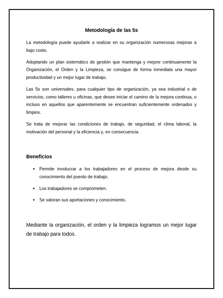 Organización, el Orden y la Limpieza, se consigue de forma inmediata una mayor