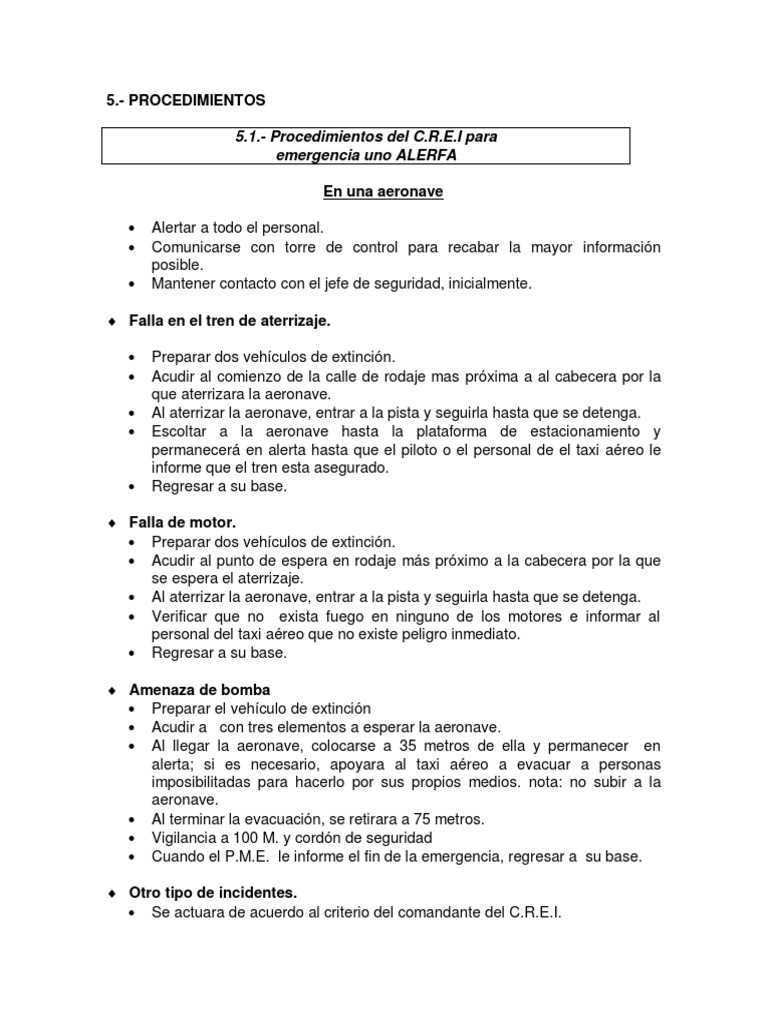 Falla de motor. Preparar dos vehculos de extincin. Acudir al punto de espera en rodaje ms prximo a la cabecera por la que se espera el aterrizaje. Al aterrizar la aeronave, entrar a la pista y seguirla hasta que se detenga. Verificar que no exista fuego en ninguno de los motores e informar al personal del taxi areo que no existe peligro inmediato. Regresar a su base. Amenaza de bomba Preparar el vehculo de extincin Acudir a con tres elementos a esperar la aeronave. Al llegar la aeronave, colocarse a 35 metros de ella y permanecer en alerta; si es necesario, apoyara al taxi areo a evacuar a personas imposibilitadas para hacerlo por sus propios medios. nota: no subir a la aeronave. Al terminar la evacuacin, se retirara a 75 metros. Vigilancia a 100 M. y cordn de seguridad Cuando el P.M.E. le informe el fin de la emergencia, regresar a su base. Otro tipo de incidentes. Se actuara de acuerdo al criterio del comandante del C.R.E.I.