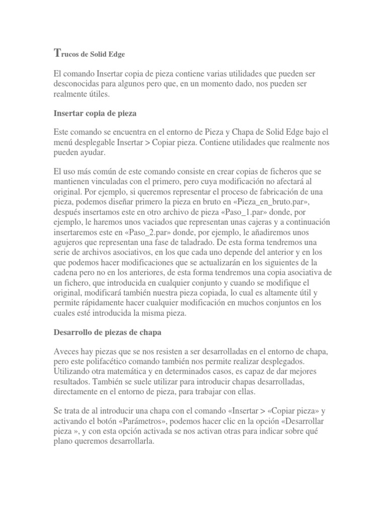El comando Insertar copia de pieza contiene varias utilidades que pueden ser desconocidas para algunos pero que, en un momento dado, nos pueden ser realmente tiles. Insertar copia de pieza Este comando se encuentra en el entorno de Pieza y Chapa de Solid Edge bajo el men desplegable Insertar > Copiar pieza. Contiene utilidades que realmente nos pueden ayudar. El uso ms comn de este comando consiste en crear copias de ficheros que se mantienen vinculadas con el primero, pero cuya modificacin no afectar al original. Por ejemplo, si queremos representar el proceso de fabricacin de una pieza, podemos disear primero la pieza en bruto en Pieza_en_bruto.par, despus insertamos este en otro archivo de pieza Paso_1.par donde, por ejemplo, le haremos unos vaciados que representan unas cajeras y a continuacin insertaremos este en Paso_2.par donde, por ejemplo, le aadiremos unos agujeros que representan una fase de taladrado. De esta forma tendremos una serie de archivos asociativos, en los que cada uno depende del anterior y en los que podemos hacer modificaciones que se actualizarn en los siguientes de la cadena pero no en los anteriores, de esta forma tendremos una copia asociativa de un fichero, que introducida en cualquier conjunto y cuando se modifique el original, modificar tambin nuestra pieza copiada, lo cual es altamente til y permite rpidamente hacer cualquier modificacin en muchos conjuntos en los cuales est introducida la misma pieza. Desarrollo de piezas de chapa Aveces hay piezas que se nos resisten a ser desarrolladas en el entorno de chapa, pero este polifactico comando tambin nos permite realizar desplegados. Utilizando otra matemtica y en determinados casos, es capaz de dar mejores resultados. Tambin se suele utilizar para introducir chapas desarrolladas, directamente en el entorno de pieza, para trabajar con ellas. Se trata de al introducir una chapa con el comando Insertar > Copiar pieza y activando el botn Parmetros, podemos hacer clic en la opcin Desarrollar pieza , y con esta opcin activada se nos activan otras para indicar sobre qu plano queremos desarrollarla.
