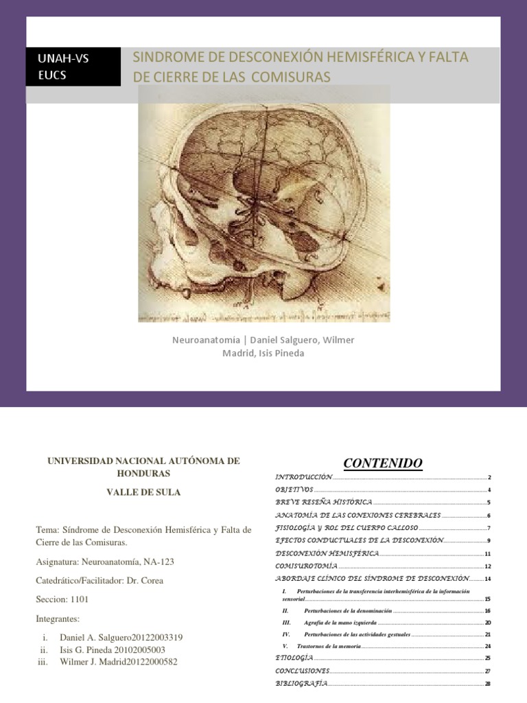 Tema: Sndrome de Desconexin Hemisfrica y Falta de Cierre de las Comisuras. Asignatura: Neuroanatoma, NA-123 Catedrtico/Facilitador: Dr. Corea Seccion: 1101 Integrantes: i. ii. iii. Daniel A. Salguero20122003319 Isis G. Pineda 20102005003 Wilmer J. Madrid20122000582