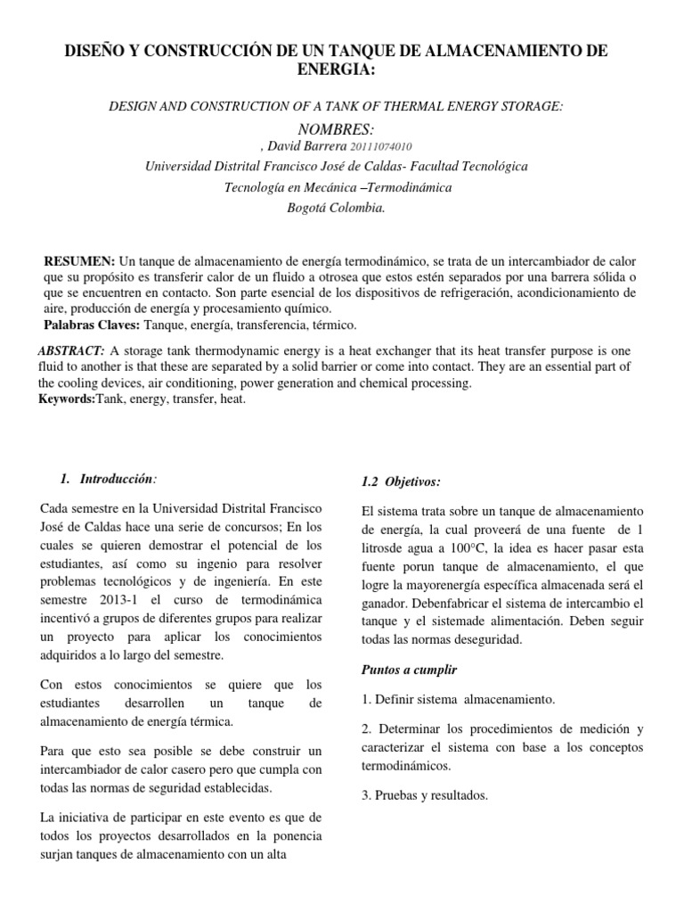 1. Introduccin: Cada semestre en la Universidad Distrital Francisco Jos de Caldas hace una serie de concursos; En los cuales se quieren demostrar el potencial de los estudiantes, as como su ingenio para resolver problemas tecnolgicos y de ingeniera. En este semestre 2013-1 el curso de termodinmica incentiv a grupos de diferentes grupos para realizar un proyecto para aplicar los conocimientos adquiridos a lo largo del semestre. Con estos conocimientos se quiere que los estudiantes desarrollen un tanque de almacenamiento de energa trmica. Para que esto sea posible se debe construir un intercambiador de calor casero pero que cumpla con todas las normas de seguridad establecidas. La iniciativa de participar en este evento es que de todos los proyectos desarrollados en la ponencia surjan tanques de almacenamiento con un alta