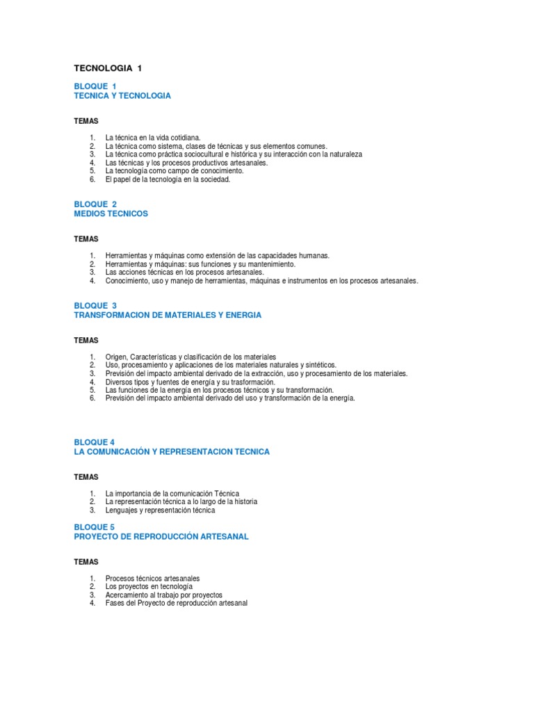 TEMAS 1. 2. 3. 4. 5. 6. La tcnica en la vida cotidiana. La tcnica como sistema, clases de tcnicas y sus elementos comunes. La tcnica como prctica sociocultural e histrica y su interaccin con la naturaleza Las tcnicas y los procesos productivos artesanales. La tecnologa como campo de conocimiento. El papel de la tecnologa en la sociedad.