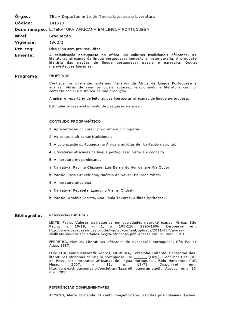 C ONTEDO PROGRAMTIC O 1. Apresentao do curso: programa e bibliografia 2. As culturas africanas tradicionais. 3. A colonizao portuguesa na frica e as lutas de libertao nacional. 4. Literaturas africanas de lngua portuguesa: histria e conceito 5. A literatura moambicana. a. Narrativa: Paulina C hiziane, Lus Bernardo Honwana e Mia C outo. b. Poesia: Jos C raveirinha, Nomia de Sousa, Eduardo White. 6. A literatura angolana. a. Narrativa: Pepetela, Luandino Vieira, Ondjaki b. Poesia: Antnio Jacinto, Ana Paula Tavares, Arlindo Barbeitos.