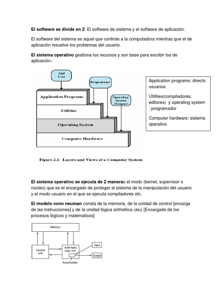 El sistema operativo se ejecuta de 2 maneras el modo (kernel, supervisor o ncleo) que es el encargado de proteger al sistema de la manipulacin del usuario y el modo usuario en el que se ejecuta compiladores etc. El modelo vonn neuman consta de la memoria, de la unidad de control [encarga de las instrucciones] y de la unidad lgica aritmtica (alu) [Encargada de los procesos lgicos y matematicos]