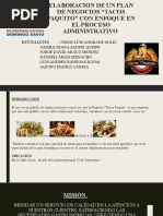 CONCEPTO Qu? (Define actividades que Cmo? (Grandes desarrollamos) actividades para Por qu? (Finalidad del desarrollar el qu) rea) Para quin? (Pblico objetivo) Carcter distintivo (lo que te hace ser diferente) RESPUESTA Brindar servicio de alimentacin Con limpieza e higiene Porque es un gusto servir y dar a conocer la comida Sociedad campechana, campechana nacional e internacional Productos frescos, de calidad y un buen sazn OBSERVACION La empresa no cuenta con misin, por lo que se realiza propuesta. La empresa no cuenta con misin, por lo que se realiza propuesta. La empresa no cuenta con misin, por lo que se realiza propuesta. La empresa no cuenta con misin, por lo que se realiza propuesta. La empresa no cuenta con misin, por lo que se realiza propuesta.