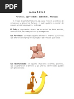FA.- Intenta disminuir al mnimo el efecto de las amenazas del entorno valindose de las fortalezas. DA.- Tiene como propsito disminuir las debilidades y neutralizar las amenazas mediante acciones de carcter defensivo. DO.- Tiene como fin mejorar las debilidades internas, con el uso de las oportunidades externas de la organizacin a la cual el entorno da ciertas oportunidades, pero no las puede explotar debido a sus mismas debilidades. LISTADO FODA Oportunidades externas: O1. Atencin a los clientes O2. Proyecciones tursticas en el estado. O3. Trayectoria relacionada. O4. Polticas fiscales favorables. O5. Ubicada en zona de desarrollo O6. Rapidez en el servicio Amenazas externas A1. Regulacin gubernamental A2. Imposiciones del sector salud A3. Altos costos de los insumos A4. Veda de productos marinos A5. Crecimiento acelerado del nmero de restaurantes A6. Aumento de restaurantes de precios ms bajos Fortalezas internas F1. Actitud de servicio F2. Experiencia Pgina 12