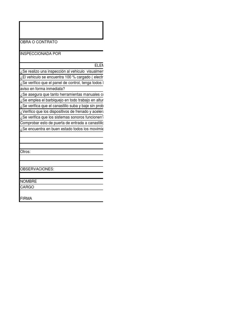 El vehiculo se encuentra 100 % cargado ( electrico) para su uso? Se verifico panel de control, tenga todos los mandos enms buen estado? Se controlaque queel los trabajos en altura sean desarrollados por de 1 trabajador para que en caso de accidente se d aviso en forma inmediata? Se asegura que tanto herramientas manuales como materiales no caigan a niveles inferiores? Se emplea el barbiquejo en todo trabajo en altura? Se verifica que el canastillo suba y baje sin problemas? Verifico que los dispositivos de frenado y aceleracin funcionan sin problemas? Se verifica que los sistemas sonoros funcionen? Comprobar esto de puerta de entrada a canastillo Se encuentra en buen estado todos los movimientos de la articulaciones del equipo?