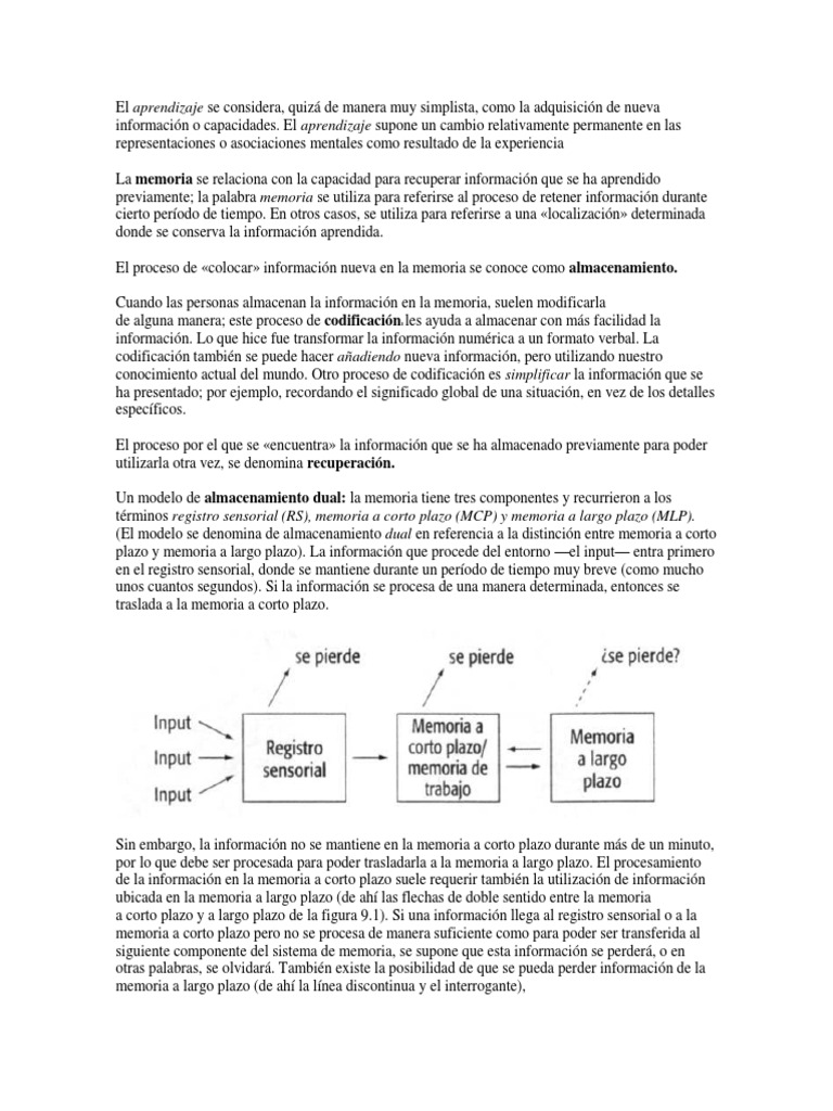 Sin embargo, la informacin no se mantiene en la memoria a corto plazo durante ms de un minuto, por lo que debe ser procesada para poder trasladarla a la memoria a largo plazo. El procesamiento de la informacin en la memoria a corto plazo suele requerir tambin la utilizacin de informacin ubicada en la memoria a largo plazo (de ah las flechas de doble sentido entre la memoria a corto plazo y a largo plazo de la figura 9.1). Si una informacin llega al registro sensorial o a la memoria a corto plazo pero no se procesa de manera suficiente como para poder ser transferida al siguiente componente del sistema de memoria, se supone que esta informacin se perder, o en otras palabras, se olvidar. Tambin existe la posibilidad de que se pueda perder informacin de la memoria a largo plazo (de ah la lnea discontinua y el interrogante),