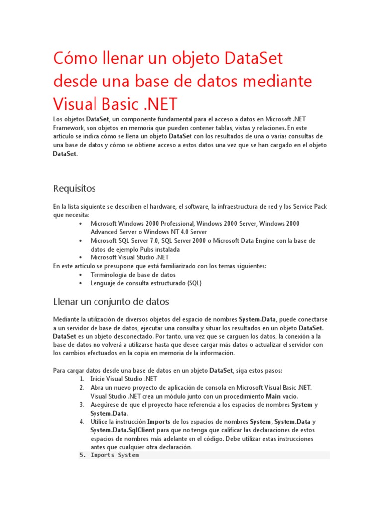 Mediante la utilizacin de diversos objetos del espacio de nombres System.Data, puede conectarse a un servidor de base de datos, ejecutar una consulta y situar los resultados en un objeto DataSet. DataSet es un objeto desconectado. Por tanto, una vez que se carguen los datos, la conexin a la base de datos no volver a utilizarse hasta que desee cargar ms datos o actualizar el servidor con los cambios efectuados en la copia en memoria de la informacin. Para cargar datos desde una base de datos en un objeto DataSet, siga estos pasos: 1. Inicie Visual Studio .NET 2. Abra un nuevo proyecto de aplicacin de consola en Microsoft Visual Basic .NET. Visual Studio .NET crea un mdulo junto con un procedimiento Main vaco. 3. Asegrese de que el proyecto hace referencia a los espacios de nombres System y System.Data. 4. Utilice la instruccin Imports de los espacios de nombres System, System.Data y System.Data.SqlClient para que no tenga que calificar las declaraciones de estos espacios de nombres ms adelante en el cdigo. Debe utilizar estas instrucciones antes que cualquier otra declaracin. 5. Imports System