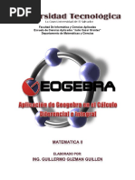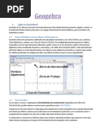 Geogebra es un programa gratuito escrito en Lenguaje Java donde se rene lgebra, Geometra y Clculo, con una serie de elementos que se pueden construir (puntos, segmentos, circunferencias, polgonos, vectores, secciones cnicas, etc.) a partir de los cuales es posible construir nuevos objetos as como establecer relaciones entre ellos, de manera que al cambiar las condiciones de los objetos iniciales se mantengan las relaciones existentes entre ellos, previamente establecidas a travs de un conjunto de herramientas disponibles. La utilizacin del programa Geogebra permite abordar la Geometra y otros aspectos de las Matemticas, a travs de la experimentacin y la manipulacin de distintos elementos, facilitando la realizacin de construcciones para deducir resultados y propiedades a partir de la observacin directa. Geogebra es una herramienta dinmica en la enseanza y el aprendizaje de las Matemticas, constituye un excelente recurso para incorporarlo en el aula. La versin del programa que est utilizndose es Geogebra [Link]
