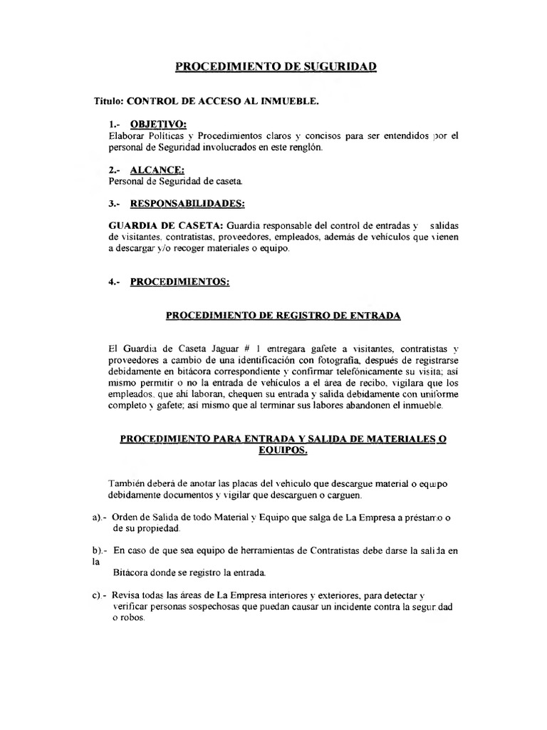 Titulo: CONTROL DE ACCESO AL INMUEBLE. 1.- OBJETIVO: Elaborar Polticas y Procedimientos claros y concisos para ser entendidos por el personal de Seguridad involucrados en este rengln.