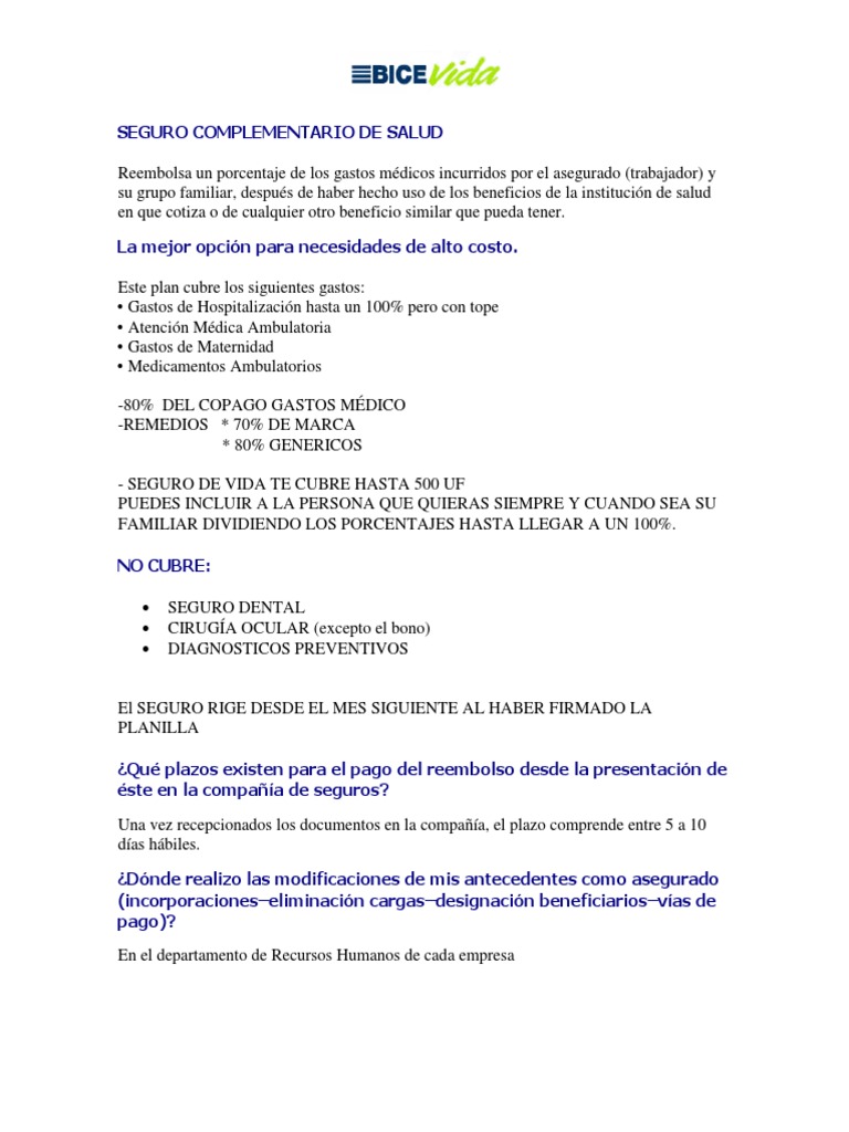 El SEGURO RIGE DESDE EL MES SIGUIENTE AL HABER FIRMADO LA PLANILLA Qu plazos existen para el pago del reembolso desde la presentacin de ste en la compaa de seguros? Una vez recepcionados los documentos en la compaa, el plazo comprende entre 5 a 10 das hbiles. Dnde realizo las modificaciones de mis antecedentes como asegurado (incorporacioneseliminacin cargasdesignacin beneficiariosvas de pago)? En el departamento de Recursos Humanos de cada empresa