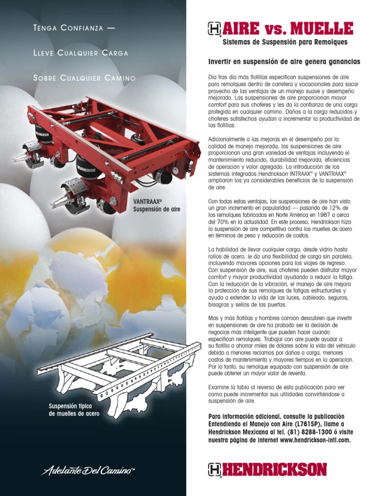 Con todas estas ventajas, las suspensiones de aire han visto un gran incremento en popularidad pasando de 12% de los remolques fabricados en Norte Amrica en 1987 a cerca del 70% en la actualidad. En este proceso, Hendrickson hizo la suspensin de aire competitiva contra los muelles de acero en trminos de peso y reduccin de costos. La habilidad de llevar cualquier carga, desde vidrio hasta rollos de acero, le da una flexibilidad de carga sin paralelo, incluyendo mayores opciones para los viajes de regreso. Con suspensin de aire, sus choferes pueden disfrutar mayor comfort y mayor productividad ayudando a reducir la fatiga. Con la reduccin de la vibracin, el manejo de aire mejora la proteccin de sus remolques de fatigas estructurales y ayuda a extender la vida de las luces, cableado, seguros, bisagras y sellos de las puertas. Ms y ms flotillas y hombres camin descubren que invertir en suspensiones de aire ha probado ser la decisin de negocios ms inteligente que pueden hacer cuando especifican remolques. Trabajar con aire puede ayudar a su flotilla a ahorrar miles de dlares sobre la vida del vehculo debido a menores reclamos por daos a carga, menores costos de mantenimiento y mayores tiempos en la operacin. Por lo tanto, su remolque equipado con suspensin de aire puede obtener un mayor valor de reventa. Examine la tabla al reverso de esta publicacin para ver como puede incrementar sus utilidades convirtindose a suspensin de aire.