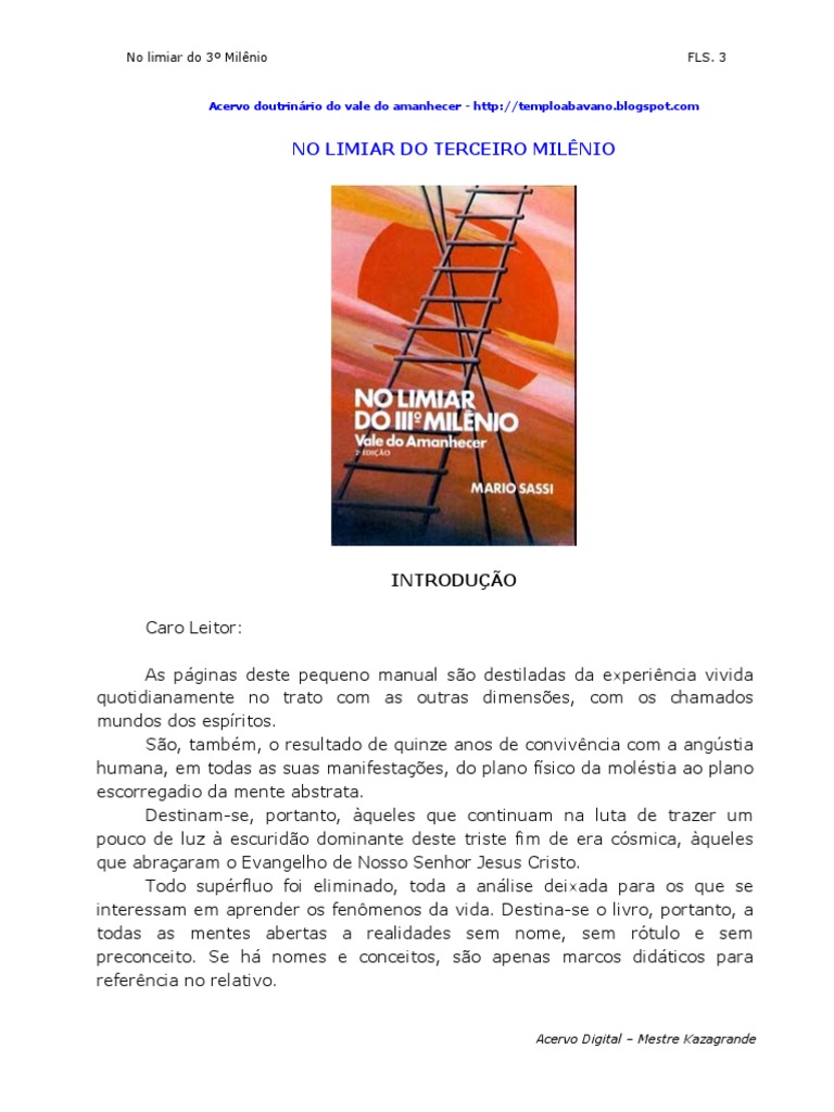 Este livro emergiu de uma comunidade medinica sui generis, uma organizao dos gurus, dos mestres tibetanos e indus, plantada num vaso Kardecista. Mas, seu principal intento trazer o Espiritismo para fora do Espiritismo. Espiritismo, como todas as doutrinas e religies, apenas um meio de se chegar a um fim, e esse fim, leitor, Voc. Pouco importa quem seja Voc. Importa desperta-lhe a conscincia de si mesmo, para que Voc possa prosseguir na sua trajetria milenar. Prosseguir, porm mais consciente, mais equilibrado, mais senhor de suas prprias foras, mais feliz. Essa obra no tem um autor, no sentido comum da palavra. Apenas um mdium Doutrinador-Receptivo captou as instrues dos Mentores, trazidas pela Clarividente Neiva, e sintetizou-as em palavras. Traz, porm, a chancela da Corrente Indiana do Espao, cuja organizao, na Terra, a Ordem Espiritualista Crist, no Vale do Amanhecer. , tambm, incompleto. Um momentum didtico num trecho do caminho inicitico. Quando necessrio, novos ensinamentos viro, outras formas grficas, novas snteses e, talvez, algumas anlises. As possveis irreverncias Cincia existem, apenas, porque a obra se destina a todos e, alm da Cincia, existe um conceito de Cincia dos que no so cientistas. Que os cientistas nos relevem a ousadia. A forma direta e a linguagem ntima se devem ao fato de que esse trabalho se destinava apenas distribuio interna, entre nossos mdiuns. Foi impresso para distribuio mais ampla porque foi decidido que assim seria mais til. Vale do Amanhecer, maio de 1972 MRIO SASSI, TRINO TUMUCHY