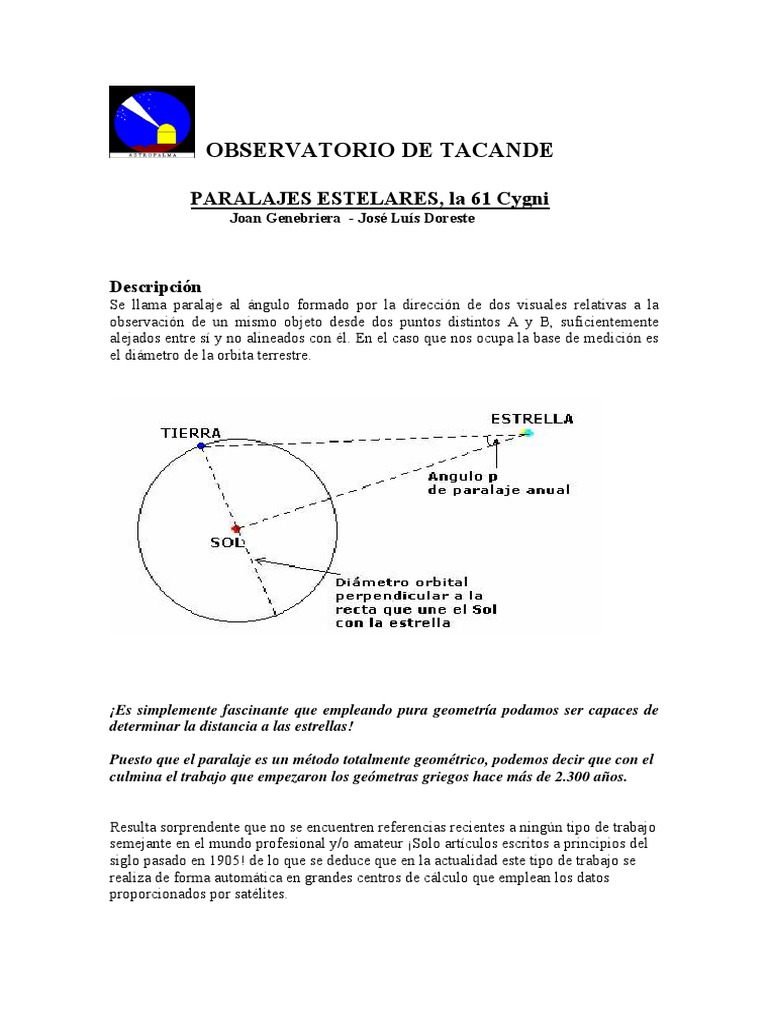 Se llama paralaje al ngulo formado por la direccin de dos visuales relativas a la observacin de un mismo objeto desde dos puntos distintos A y B, suficientemente alejados entre s y no alineados con l. En el caso que nos ocupa la base de medicin es el dimetro de la orbita terrestre.